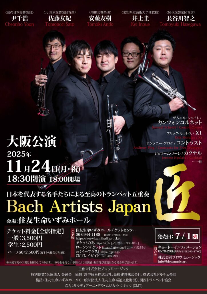 高度な技術と抜群のチームワークにより常に聴衆を魅了してきた、日本を代表するトランペット奏者5名によるアンサンブル「Bach Artists Japan 匠」、待望の大阪公演がついに実現!いづみホールに響き渡る、トランペット5本だけで奏でる圧倒的なサウンドをぜひ体感してください。